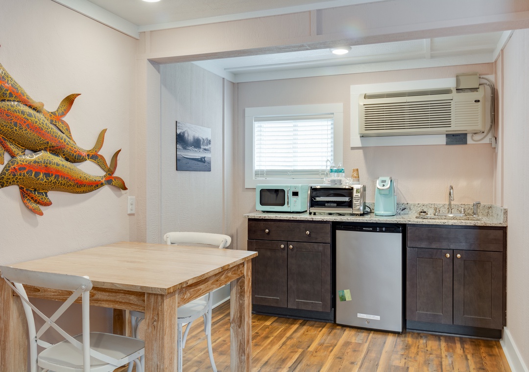 This spacious room features a king bed, mini-fridge, microwave, coffee maker, convection toaster oven.