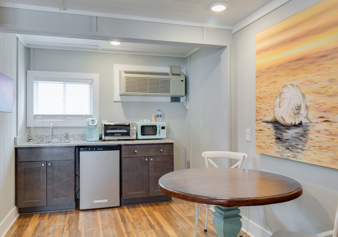This spacious room features a king bed, mini-fridge, microwave, coffee maker, convection toaster oven.