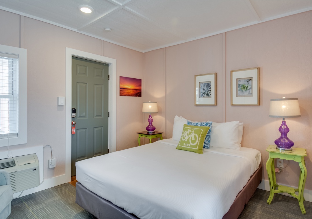 This room features a queen bed, mini-fridge, microwave, coffee maker, convection toaster oven.