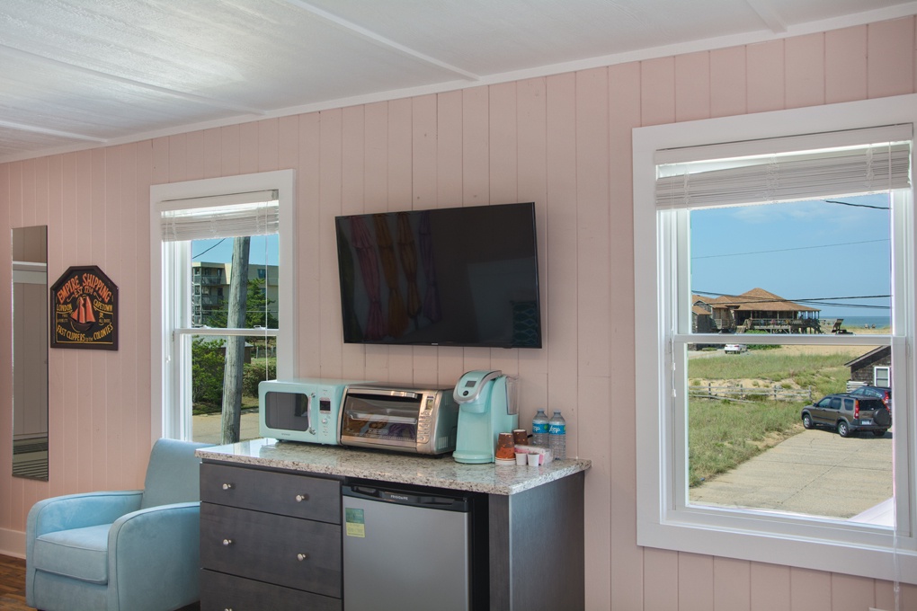 Featuring views of the ocean and pool, this second floor room offers two queen sized beds, mini-fridge, microwave, coffee maker, convection toaster oven.