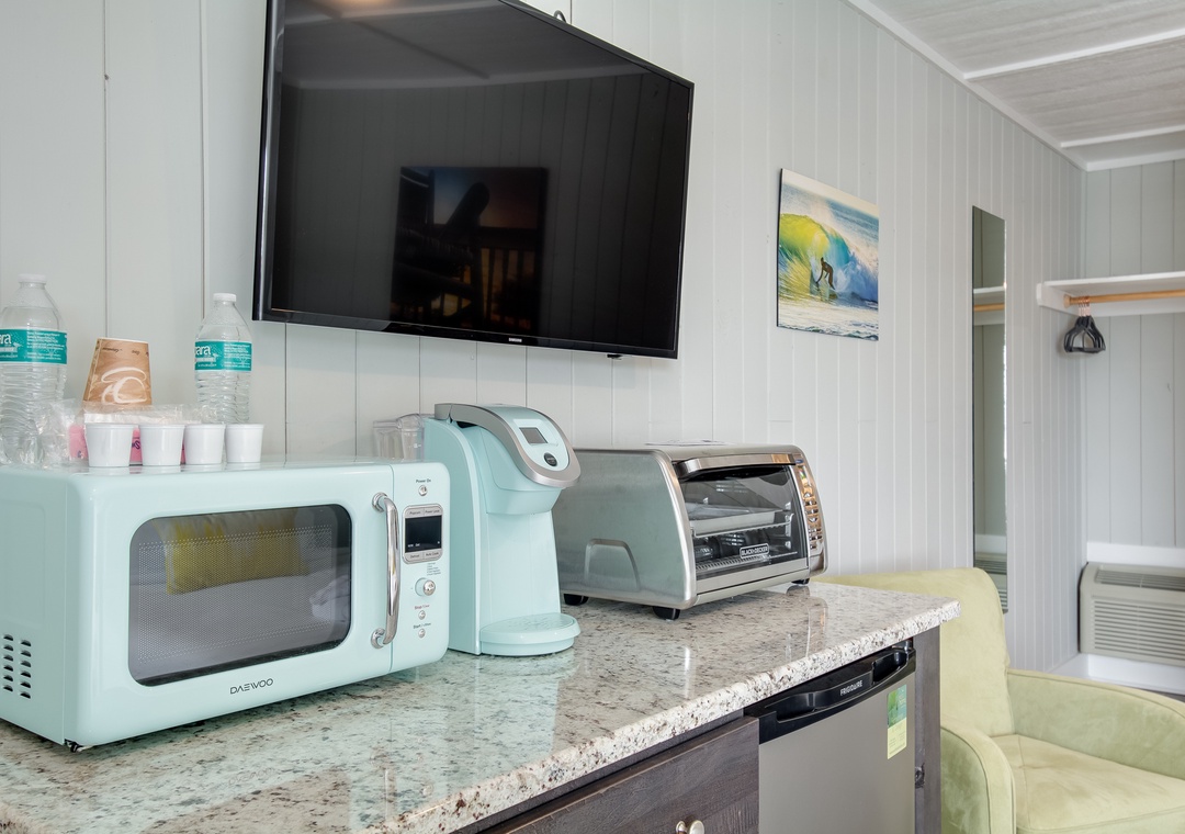 Overlooking the pool, this second-floor room offers two queen sized beds, mini-fridge, microwave, Keurig coffee maker and a convection toaster oven.