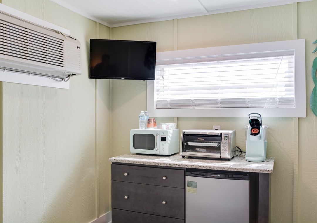This room is on the second floor and features a queen sized bed, mini-fridge, microwave, Keurig coffee maker and a convection toaster oven.